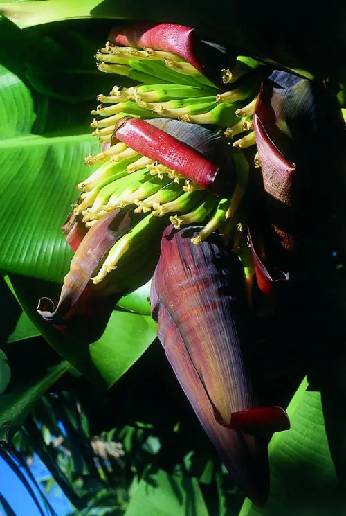 Banana este o plantă perenă impunătoare, care dă fructe și flori la fel de mărețe. Poate crește până la 15 metri. Florile sale albe se grupează pe articulațiile pedunculilor mari roșii purpurii. Florile purtate pe rizom (rădăcina principală), cresc în interiorul trunchiului gol și apoi ies direct la lumină sau cresc înclinate în jos. Această plantă se propagă numai prin tăierea tulpinii. Fructele sale sunt sterile și se nasc exclusiv din flori feminine.
